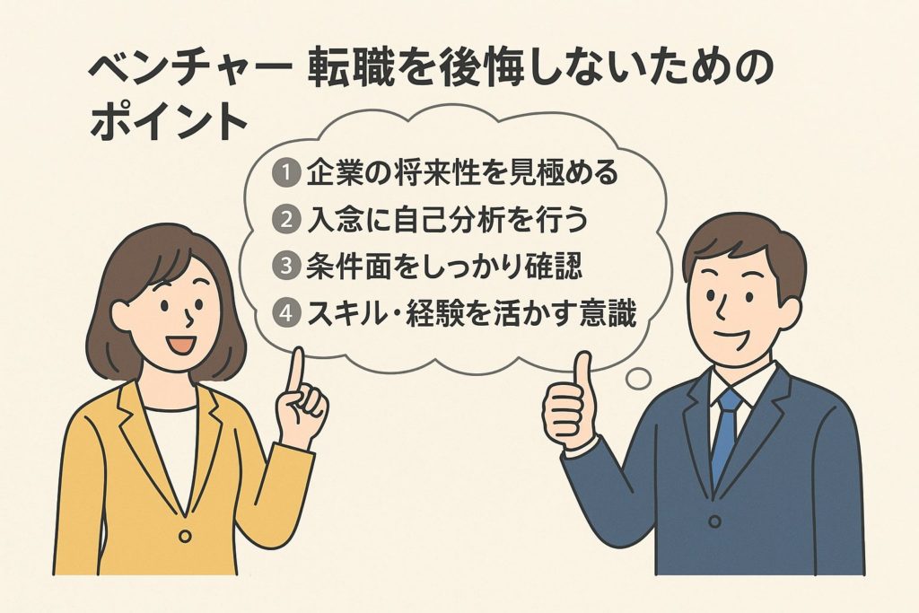 このセクションでは、ベンチャー転職で後悔しないために押さえておきたいポイントを3つに分けて解説します。