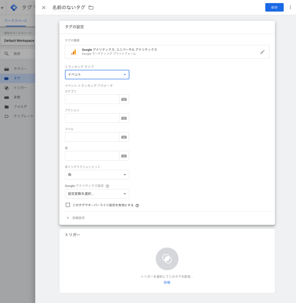今回はクリックのイベントを計測したいので、トラッキングタイプを「イベント」を設定します。