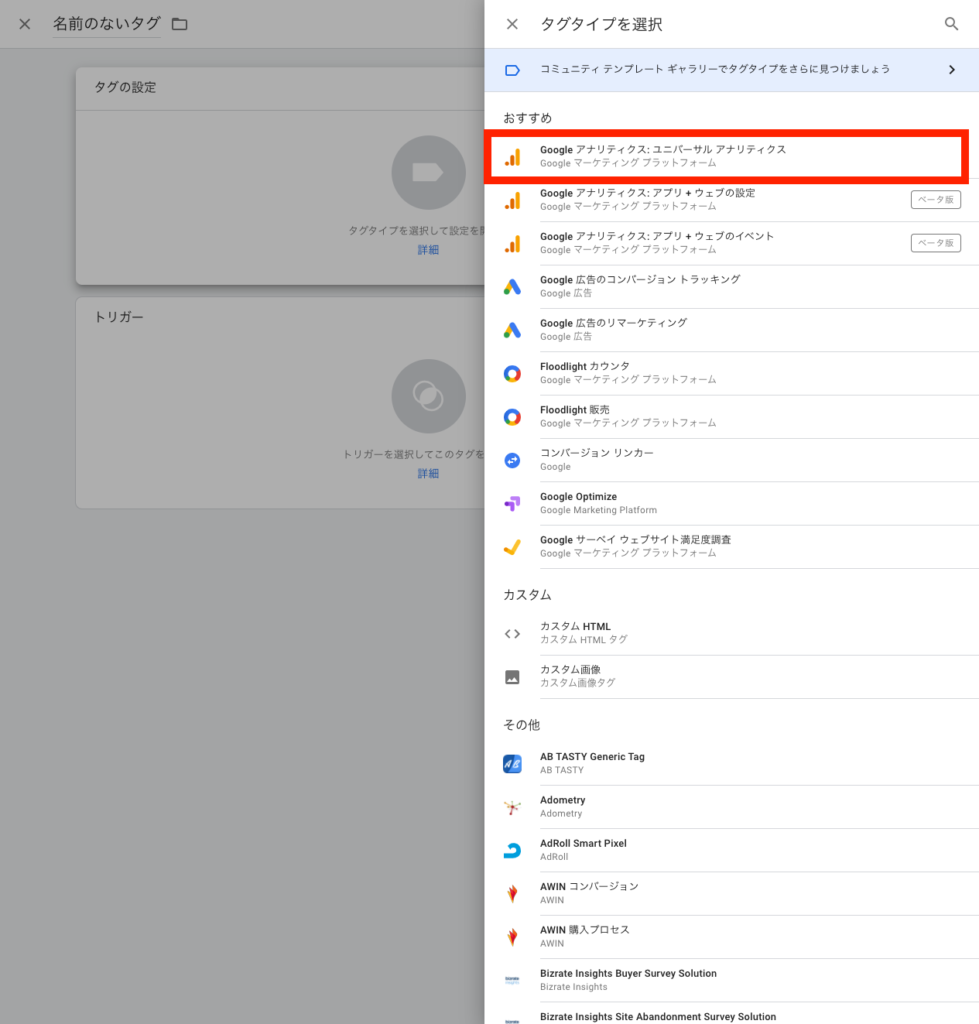 タグはGoogleアナリティクスユニバーサルアナリティクスを選択します。