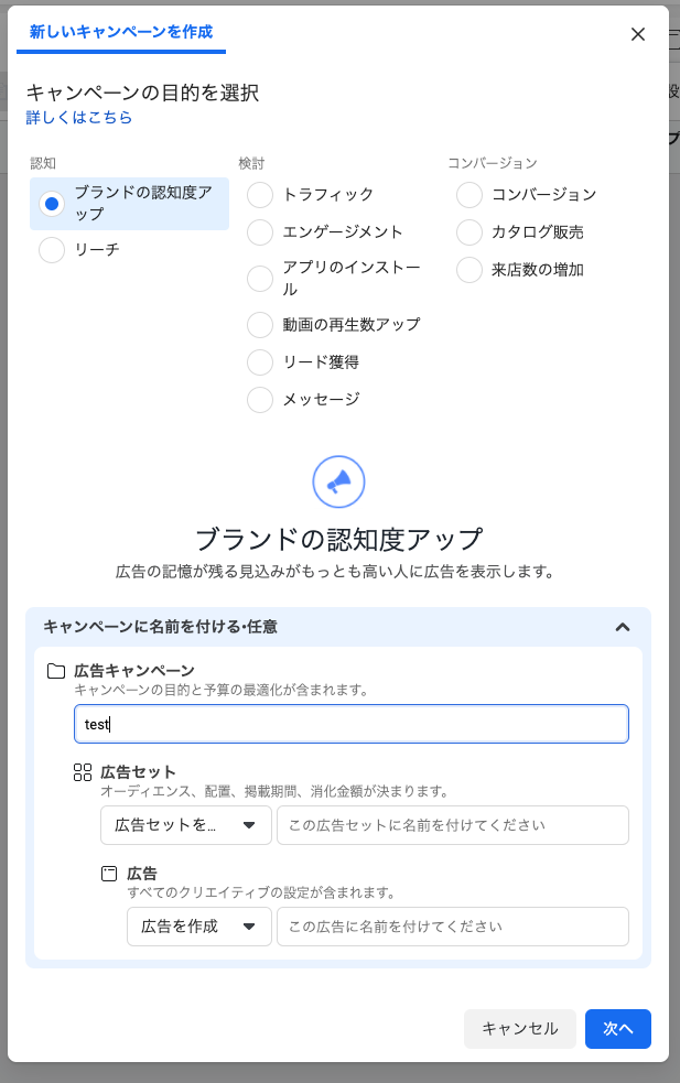 先ほどお伝えしたように自分が行うプロモーションに最適な目的を選択するようにします。