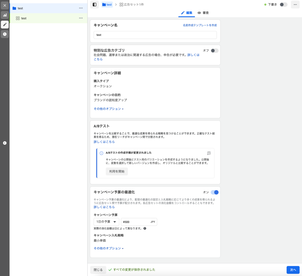 キャンペーンと広告セットをどのように分けるのがいいかをまず設計していきます。