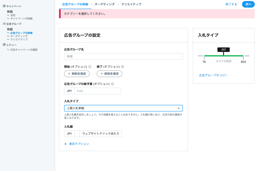 自動入札を選択した場合は1クリックあたりの単価をTwitter側の機械が自動で設定するため、ときにはクリック単価(CPC)がかなり高くなってしまいます。