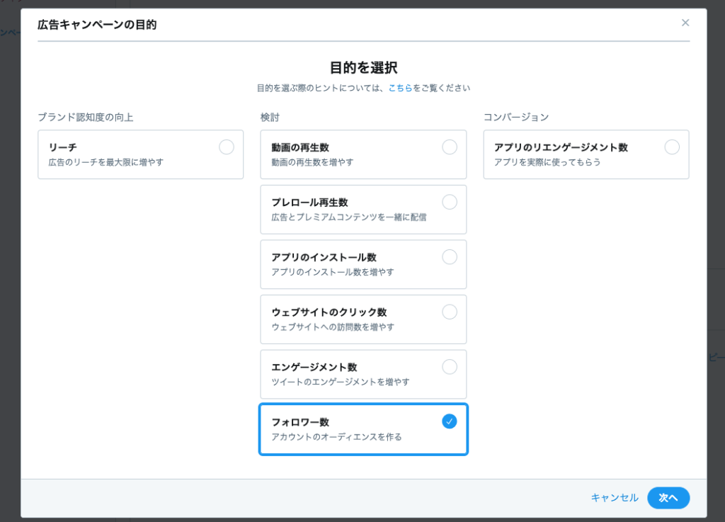自分のTwitterフォロワーを増やしたいというニーズもあるんじゃないかなと思ってフォロワーを広告を打つことで増やすキャンペーンの設定も書いておきます!